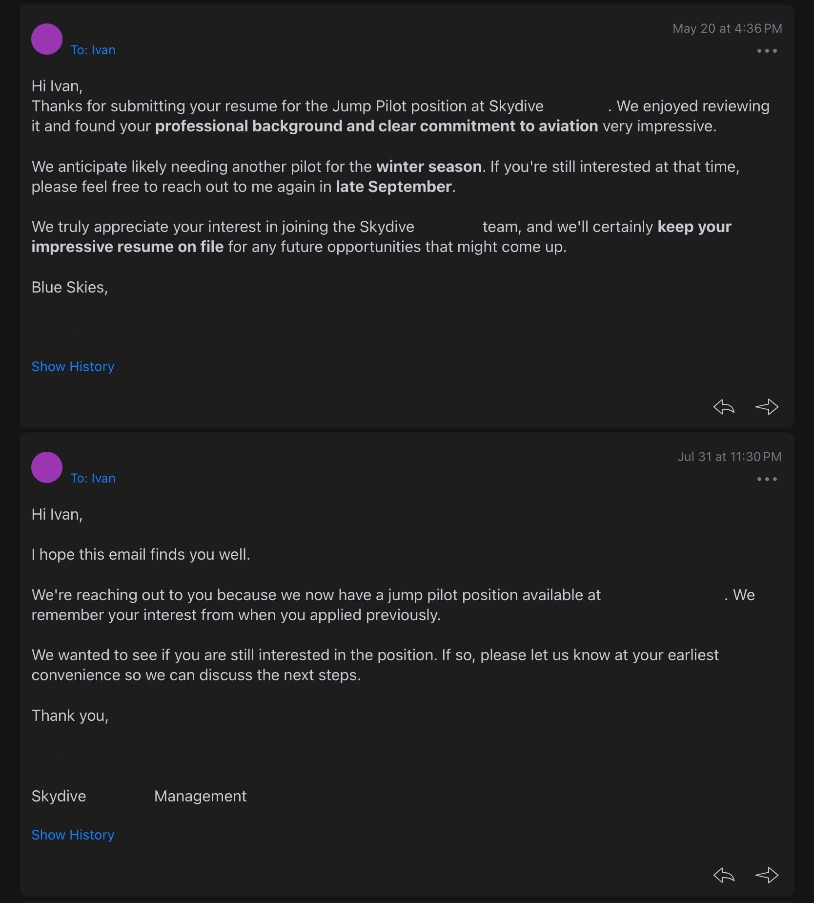It seems most companies straight up HATE being flooded with emails from us. That’s actually what the owner of Paragon Skydive meant in the low time pilot job alert I sent for their C206 job: he wasn’t unhappy about the quality of the applications he was getting, it was the volume lol