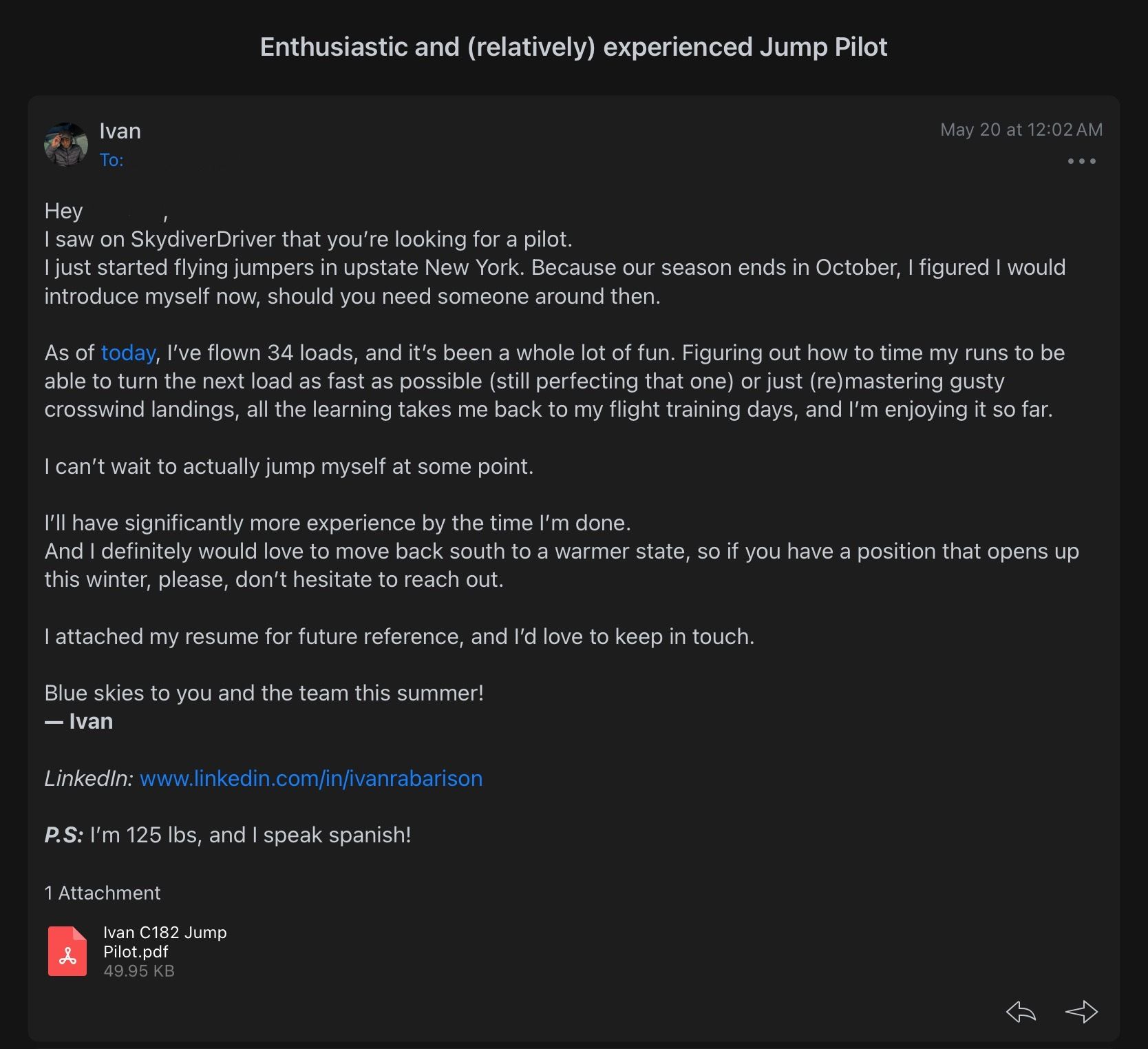 “I saw on SkydiverDriver that you’re looking for a pilot. I just started flying jumpers in upstate New York. Because our season ends in October, I figured I would introduce myself now, should you need someone around then” → makes sense to open the email with the reason why I’m reaching out, and being honest upfront by saying I’m not looking right now, but maybe later.