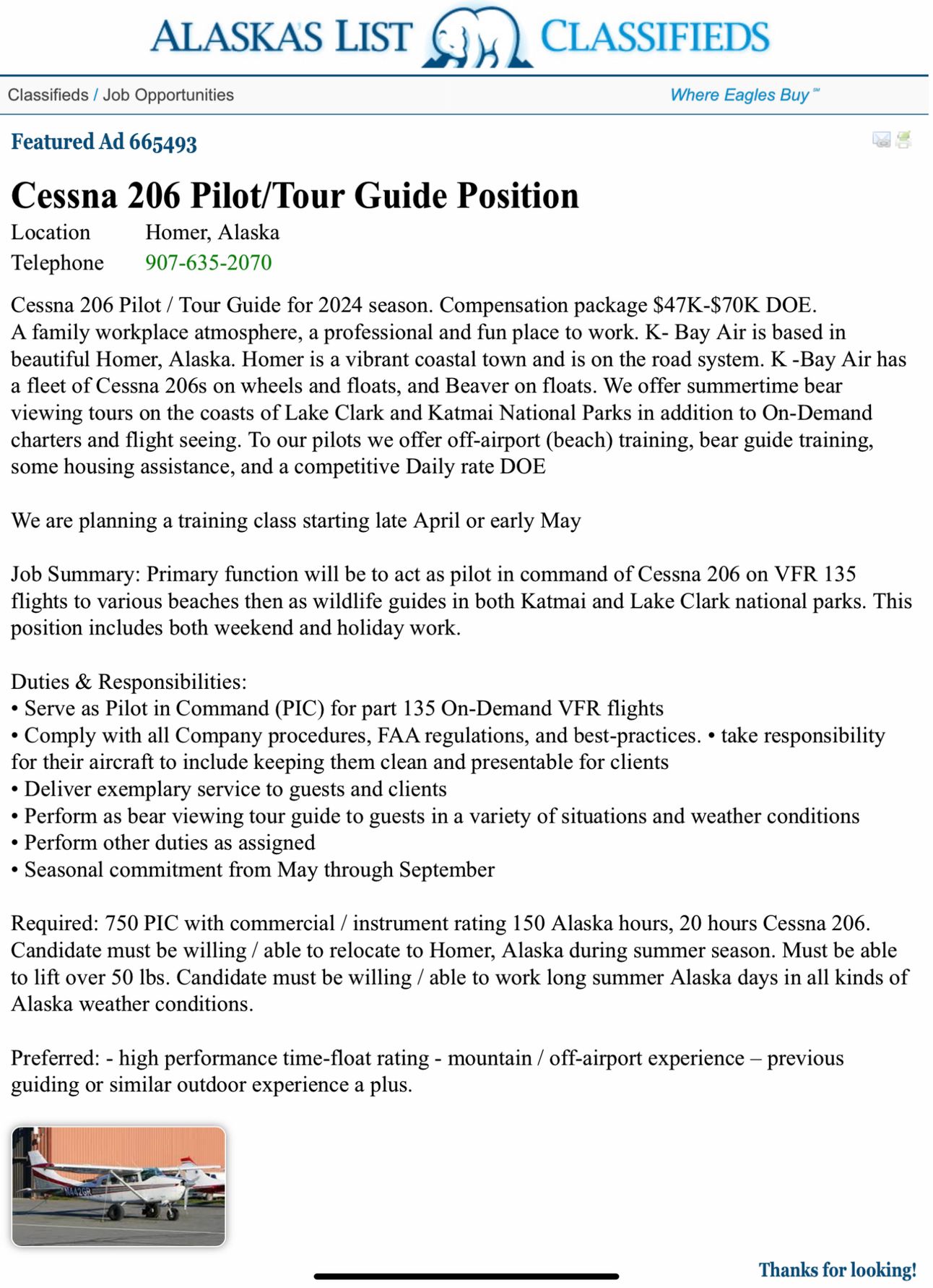 Requirements: 750PIC, 150 AK hours, 20 hours on C206, relocation to Homer (AK), able to lift over 50lbs, work long summers, in various weather conditions