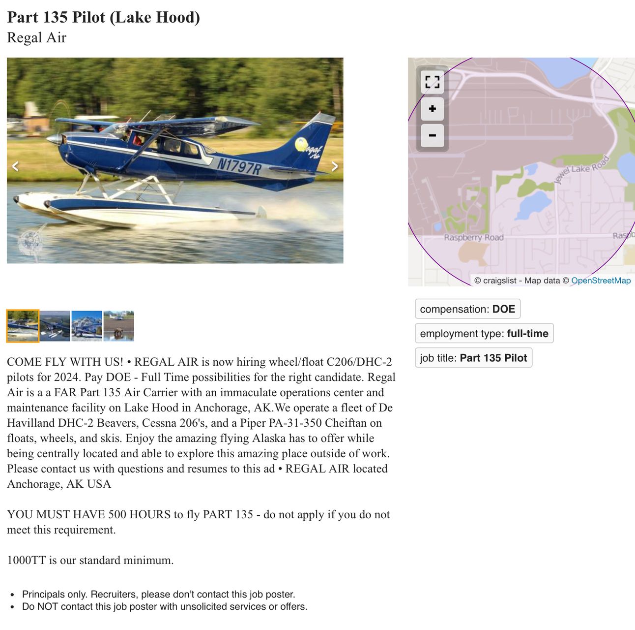 But first, we have some higher-time jobs hiring (with minimums over 500 hours total time). Shoutout to Scott Lawler from the Low Time Pilot Jobs - FREE facebook group* (link), a goldmine of “niche” job opportunities. If you want to fly float, tailwheel, skis or in remote AK, you should join us. Of all the low time pilots groups on Facebook, I think his is the most active. In fact, a lot of the job updates have and will come from there.
