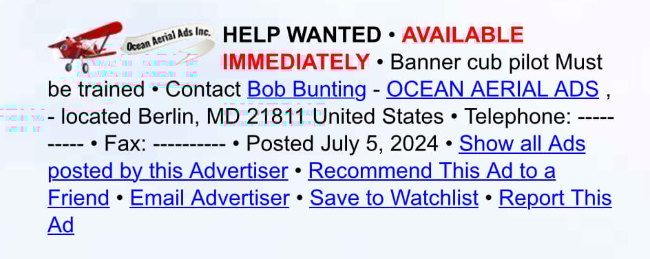 It seems one of their pilots lost his engine above some trees. He’s fine, but he’s probably done flying for the season. So they need an experienced banner tow pilot to fill in on the week ends.
