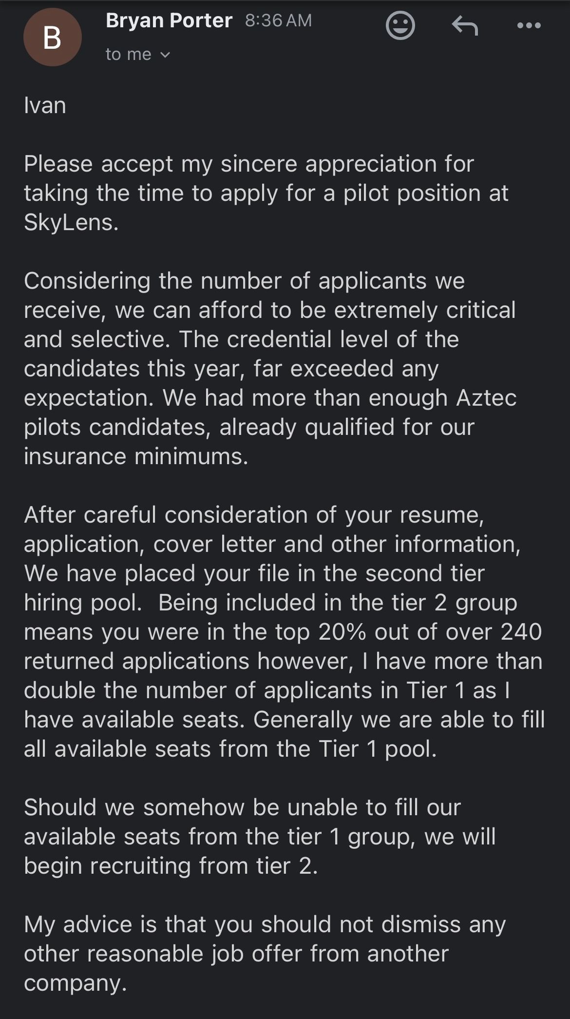 I also believe Skylens’ transparency in their hiring preferences made everything even more competitive. Pilots who met and exceeded competitive and insurance minimums have been placed in Tier 2 this year, although we would’ve made Tier 1 last year.